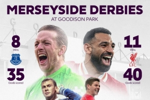 據(jù)官方統(tǒng)計(jì),古迪遜公園球場(chǎng)共進(jìn)行了33場(chǎng)英超默西塞德郡德比,利物浦11勝14平8負(fù)占優(yōu),打進(jìn)40球丟35球。