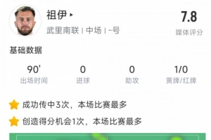 今年冬季轉會期,武里南聯(lián)官宣祖伊正式加盟,他與亞泰的合同已于去年年底到期。此役對陣蔚山HD,祖伊代表武里南聯(lián)首發(fā)并打滿全場,貢獻3次射門,成功傳中3次和創(chuàng)造得分機會1次,均為本場比賽最多。