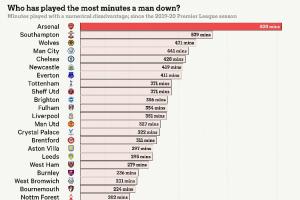 自2019-20賽季以來,英超球隊少一人作戰(zhàn)累計時長排行榜