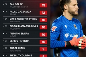 體育資訊12月28日訊?年終歲末,《Squawka》盤(pán)點(diǎn)了西甲門(mén)將零封榜top10,皇家社會(huì)的雷米羅以18次位居榜首,馬競(jìng)門(mén)將奧布拉克以15次位居第二。