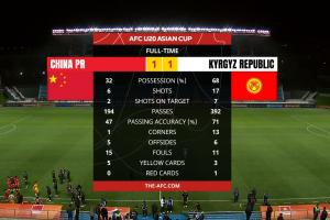 2023年U20亞洲杯D組末輪,中國U20國青與吉爾吉斯斯坦U20戰(zhàn)成1-1平,中國U20小組第二出線,但本場比賽在數(shù)據(jù)統(tǒng)計方面,當時的中國U20國青被對手全面壓制,控球率僅僅32%,射門次數(shù)更是6比17遠遠落后于對手,而國青的傳球成功率僅為47%。