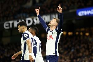 體育資訊2月17日訊 英超第25輪焦點(diǎn)戰(zhàn),熱刺對(duì)陣曼聯(lián)。第12分鐘,麥迪遜補(bǔ)射破門(mén),幫助熱刺拔得頭籌。