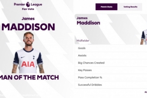 體育資訊2月17日訊 本輪英超焦點(diǎn)戰(zhàn),熱刺1-0小勝曼聯(lián)。賽后,打進(jìn)唯一進(jìn)球的麥迪遜當(dāng)選全場(chǎng)最佳球員。
