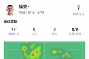 體育資訊2月20日訊 曼城在本輪歐冠附加賽次回合0-3落后皇馬,福登本場(chǎng)數(shù)據(jù)如下: