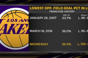 2016年3月18日,湖人90-95不敵太陽,太陽命中率為36.0%。
