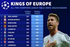體育資訊2月21日訊 歐冠淘汰賽附加賽已經(jīng)結(jié)束,《轉(zhuǎn)會(huì)市場》也統(tǒng)計(jì)了92-93賽季改制后的歐冠歷史積分榜,皇馬無懸念領(lǐng)跑。