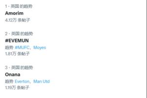 埃弗頓vs曼聯(lián)進行時,英國熱搜前三:阿莫林、埃弗頓vs曼聯(lián)、奧納納,第5多古、第7霍伊倫、第8滕哈赫