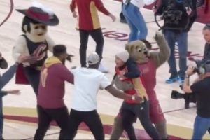 比賽間隙,一位身穿23號球迷的騎士球迷投進中場三分,喜獲10000美元獎金!
