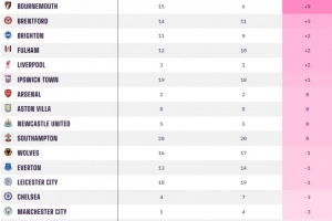 體育資訊2月26日訊 OPTA對比了當前英超排名和賽季之初的預(yù)測排名的情況,諾丁漢森林表現(xiàn)最佳、曼聯(lián)最令人失望。