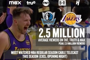 ?本賽季(不包括開幕夜)收視率最高的NBA常規(guī)賽有線電視轉(zhuǎn)播比賽