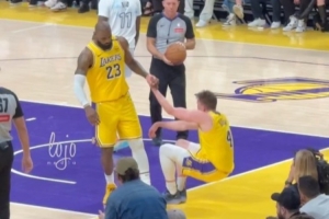 賽后,詹姆斯接受了記者采訪。他說道:“任何時候你摔倒了,別動,你的兄弟會去扶你起來?!?/p>