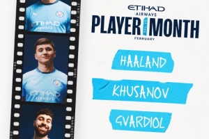 體育資訊2月28日訊 曼城官方公布了2月隊內(nèi)最佳球員的候選名單,分別是哈蘭德、胡桑諾夫和格瓦迪奧爾。
