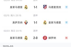 體育資訊03月02日訊 西甲第26輪,皇馬1-2遭貝蒂斯逆轉(zhuǎn)?;蜀R聯(lián)賽狀態(tài)不佳,近五輪僅1勝2平2負(fù)。