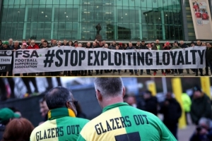 比賽開始前,兩隊球迷在老特拉福德球場前進(jìn)行了聯(lián)合抗議活動,拉出了寫有“停止剝削忠誠”的橫幅。此外,也有部分曼聯(lián)球迷仍在堅持表達(dá)對格雷澤家族的不滿,他們穿上了印有“格雷澤滾蛋”的球衣。