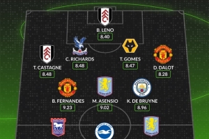 后衛(wèi):卡斯塔涅(富勒姆,8.48分)、理查茲(水晶宮,8.48分)、托迪-戈麥斯(狼隊,8.47分)、達(dá)洛特(曼聯(lián),8.28分)