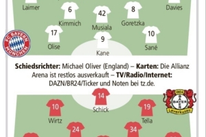 諾伊爾/萊默爾、于帕梅卡諾、金玟哉、戴維斯/基米希、格雷茨卡/奧利塞、穆西亞拉、薩內(nèi)/凱恩