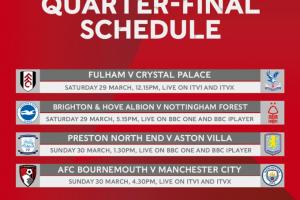 體育資訊3月6日訊 今天,英足總在官網(wǎng)公布了足總杯1/4決賽的比賽時間,伯恩茅斯對陣曼城的比賽將于3月30日晚23:30打響。