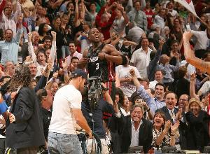 2009年3月9日,熱火主場迎戰(zhàn)公牛。雙方在常規(guī)時間殺得難解難分,比賽被拖入加時。一個不夠再加一個,到了第二個加時最后時刻,雙方戰(zhàn)至127平。公牛最后一攻壓時間到5秒以內(nèi)才發(fā)動,但韋德補(bǔ)防完成搶斷帶球狂奔,過半場開始起步,與時間賽跑的閃電俠騎馬射箭投出三分,皮球空心命中,壓哨絕殺!