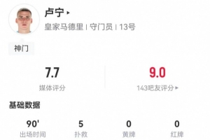體育資訊3月10日訊 皇馬在本輪西甲2-1力克巴列卡諾,盧寧本場(chǎng)數(shù)據(jù)如下: