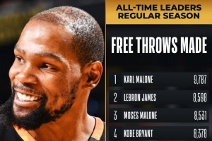 這樣一來,杜蘭特生涯常規(guī)賽罰球命中數(shù)達到7241次,超越諾維茨基(7240)升至NBA歷史第8位,下一步將追逐喬丹。