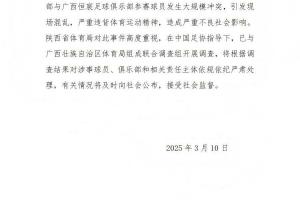 體育資訊03月11日訊 陜西省體育局昨日發(fā)布情況通報,將調查西部杯的大規(guī)模沖突,依規(guī)依紀嚴肅處理。