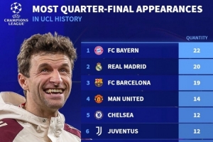 改制后歐冠共12支球隊至少8次晉級八強(qiáng):