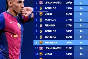 體育資訊3月12日訊 本賽季拉菲尼亞在歐冠已經(jīng)有11球5助攻,直接參與16球。德轉(zhuǎn)也盤點了歐冠歷史單賽季參與進球榜,其中C羅22球居首,具體如下(進球+助攻):