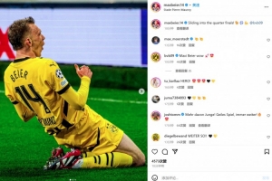 拜爾也曬出自己進球后的滑跪慶祝照,并調侃:“一路滑進歐冠八強!?????? @多特蒙德俱樂部”。