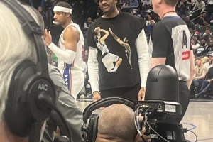 76人內(nèi)線德拉蒙德今天穿著一件印著諾維茨基迎著鄧肯金雞獨(dú)立圖案的T恤,向這名獨(dú)行俠傳奇致敬。