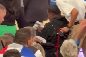 這位觀眾名叫崔西-摩根,是美國一位喜劇演員,也是尼克斯的死忠粉。他在場邊觀戰(zhàn)時突然流鼻血,幾乎站不起來,最后被輪椅推出場外。