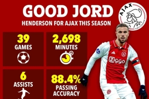 本賽季,喬丹-亨德森在阿賈克斯發(fā)揮不俗,他出戰(zhàn)39場比賽共計2698分鐘,貢獻(xiàn)6次助攻,傳球成功率88.4%,同時還有41次攔截和49次鏟搶。