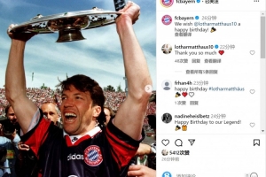 拜仁官方社媒曬出馬特烏斯效力球隊(duì)期間舉起德甲冠軍獎(jiǎng)盤的照片,配文:“我們祝馬特烏斯生日快樂!”