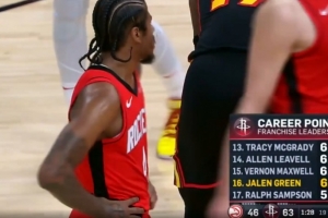 體育資訊3月26日訊 NBA常規(guī)賽,火箭上半場以65-48領(lǐng)先老鷹。