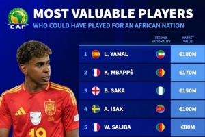 體育資訊3月27日訊 《轉會市場》統(tǒng)計了當前第二國籍為非洲國家的球員身價榜單,亞馬爾壓姆巴佩居首。
