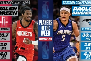 體育資訊4月1日訊 NBA官方今日宣布,火箭球星杰倫-格林和魔術(shù)球星班凱羅分別當(dāng)選上周NBA西部和東部周最佳球員。