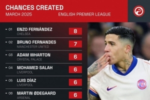 體育資訊4月1日訊 Squawka統(tǒng)計(jì)了3月份球員在英超創(chuàng)造機(jī)會(huì)的次數(shù),并列出榜單,恩佐8次居首,B費(fèi)7次第二。