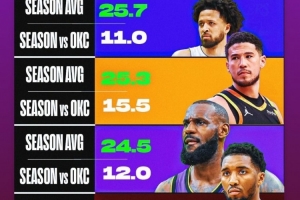 圖片內(nèi)容為眾球星本賽季場均得分和打雷霆時的場均得分對比。亞歷山大配文:“多特效應?!?/p>