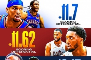 圖中數(shù)據(jù)為場(chǎng)均凈勝分。聯(lián)盟歷史上曾多次出現(xiàn)單賽季兩隊(duì)場(chǎng)均凈勝分達(dá)10+,沒(méi)出現(xiàn)過(guò)3隊(duì)同時(shí)做到的情況。