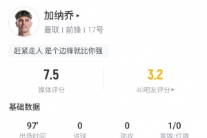 數(shù)據(jù)方面,加納喬本場(chǎng)比賽狂射6腳,但無(wú)一射正;5次嘗試過(guò)人,2次成功,18次丟失球權(quán)。5次關(guān)鍵傳球較為亮眼,但13次對(duì)抗4次成功,評(píng)分7.5分。