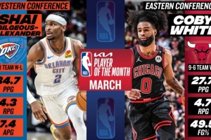 體育資訊4月2日訊 今日NBA官方公布了上個(gè)月聯(lián)盟的月最佳球員,西部為亞歷山大,東部為科比-懷特。