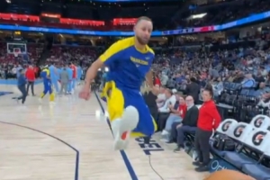比賽開(kāi)始前,庫(kù)里再次整活,他一個(gè)沖刺秀出了凌空飛踢,體態(tài)非常輕盈。