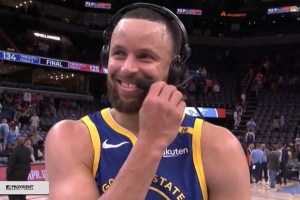體育資訊4月2日訊 NBA常規(guī)賽,勇士客場134-125力克灰熊,庫里賽后在場邊接受了媒體采訪。