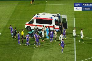 中超第4輪國(guó)安客戰(zhàn)津門(mén)虎,第4分鐘,國(guó)安左路傳中,斯帕吉奇頭球爭(zhēng)頂后倒地昏迷不起,隊(duì)醫(yī)&救護(hù)車迅速進(jìn)場(chǎng)!簡(jiǎn)單治療后,救護(hù)車載著斯帕吉奇駛離球場(chǎng)。