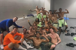 萊萬(wàn)在社交媒體上曬出巴薩球員們擠在狹小浴池內(nèi)的合照,配文:“我們進(jìn)決賽啦!”