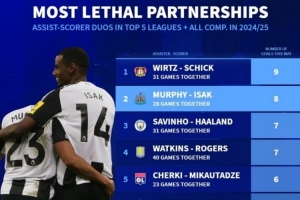 本賽季五大聯(lián)賽助攻→進(jìn)球連線排名(前者給后者助攻):