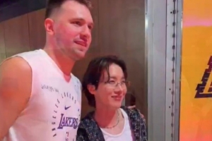 賽前湖人球星東契奇與防彈少年團(BTS)成員J-Hope互動,為其送上球鞋并合影留念。