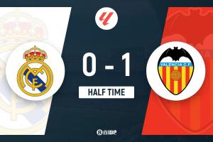上半場(chǎng)傷停補(bǔ)時(shí)3分鐘,半場(chǎng)結(jié)束,皇馬暫0-1瓦倫西亞。