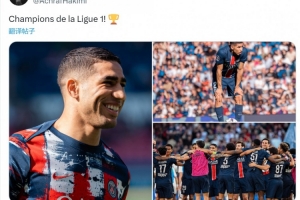 這是阿什拉夫2021年加盟巴黎以來第4次問鼎法甲,他在社交媒體上曬出比賽照片,配文:“法甲冠軍!”
