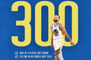本賽季庫里命中293記三分,距離個(gè)人第6個(gè)單賽季300+三分也只有一步之遙。