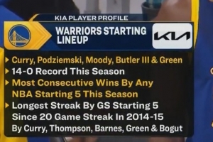 庫里、波杰姆、穆迪、巴特勒和格林的首發(fā)陣容本賽季戰(zhàn)績14勝0負,創(chuàng)聯(lián)盟本賽季紀錄;